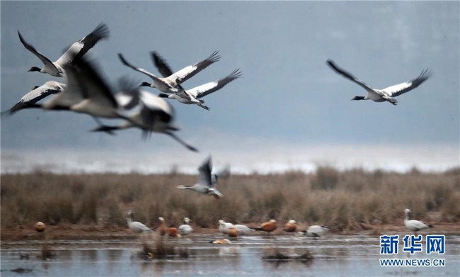 2月21日在草海國家級自然保護區(qū)內(nèi)拍攝的黑頸鶴。新華社發(fā)(韓賢普攝)