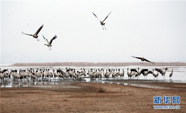 當(dāng)日,貴州省威寧彝族回族苗族自治縣草海國家級自然保護區(qū)內(nèi),黑頸鶴翩躚起舞、姿態(tài)萬千。