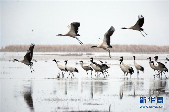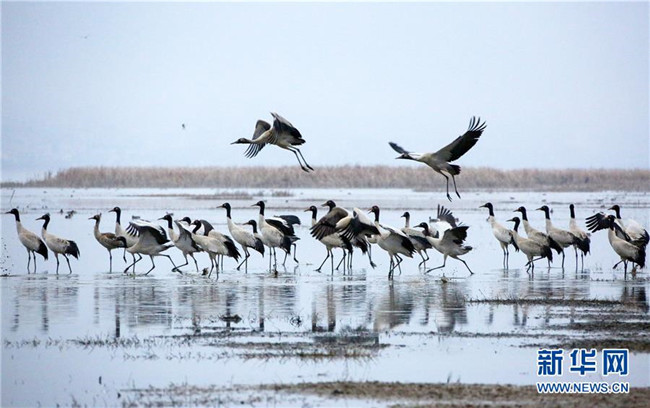 草海保護區(qū)是黑頸鶴越冬的主要棲息地之一,其在草海越冬期約為每年10月下旬到次年3月底。黑頸鶴是全球唯一在高原生長、繁殖的鶴類。新華社記者楊楹攝
