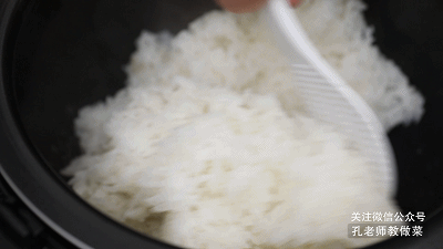 2.電飯鍋選“精煮檔”煮米,待功能結(jié)束后揭開蓋子,聞到米飯香氣撲鼻,用飯勺將米飯打散,再燜5分鐘。
