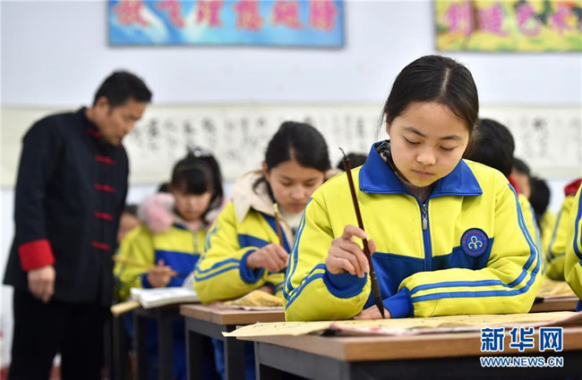 2月28日,在石家莊市藁城區(qū)韓家洼中學(xué),學(xué)生在練習(xí)寫毛筆字。新華社發(fā)(張曉峰 攝)