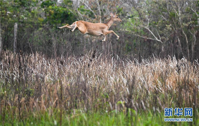 在海南大田坡鹿自然保護(hù)區(qū)內(nèi),一只坡鹿飛躍草叢(2018年4月3日攝)。國家一級保護(hù)動(dòng)物海南坡鹿是特產(chǎn)于海南島的熱帶珍稀鹿種,20世紀(jì)曾瀕臨滅絕。近年來,當(dāng)?shù)赝ㄟ^多種方式開展保護(hù)?,F(xiàn)在,海南坡鹿數(shù)量逐漸增多、種群逐漸穩(wěn)定,成為海南綠色生態(tài)的一張名片。 新華社記者 楊冠宇 攝