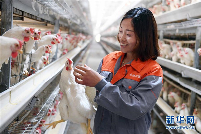 在云南省鎮(zhèn)雄縣五德鎮(zhèn)渡船壩社區(qū),返鄉(xiāng)創(chuàng)業(yè)的劉艷在養(yǎng)殖場查看優(yōu)質(zhì)蛋雞(2018年6月4日攝)。新華社記者 楊宗友 攝