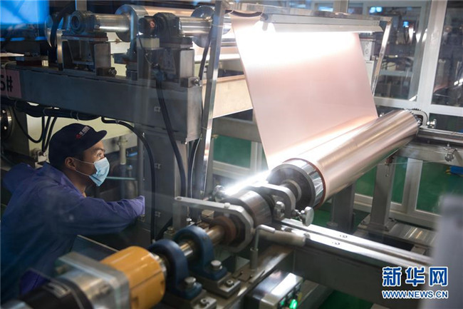 在安徽省銅陵市華創(chuàng)新材料有限公司生產(chǎn)車間,一名員工在監(jiān)測鋰電銅箔生產(chǎn)過程(2018年8月8日攝)。新華社記者 金立旺 攝