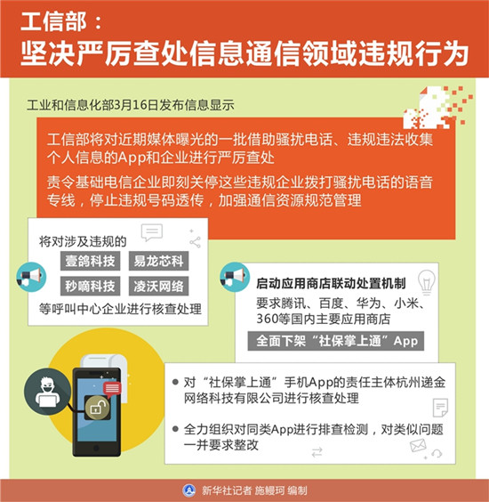 據(jù)了解,工信部將對(duì)涉及違規(guī)的壹鴿科技、易龍芯科、秒嘀科技和凌沃網(wǎng)絡(luò)等呼叫中心企業(yè)進(jìn)行核查處理。同時(shí),啟動(dòng)應(yīng)用商店聯(lián)動(dòng)處置機(jī)制,要求騰訊、百度、華為、小米、360等國內(nèi)主要應(yīng)用商店全面下架“社保掌上通”App,對(duì)“社保掌上通”手機(jī)App的責(zé)任主體杭州遞金網(wǎng)絡(luò)科技有限公司進(jìn)行核查處理,并全力組織對(duì)同類App進(jìn)行排查檢測,對(duì)類似問題一并要求整改。