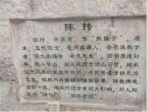 陳摶:陳摶(872年—989年),字“圖南”,號“扶搖子”、“希夷先生”(“希”指視而不見,“夷”指聽而不聞),常被視為神仙,尊稱為陳摶老祖、希夷祖師等。主張以睡眠,休養(yǎng)生息,時(shí)常一眠數(shù)日,人稱睡仙。相傳紫微斗數(shù)及無極圖說皆為陳摶之創(chuàng)作。五代末,宋朝初期亳州真源(今河南鹿邑)人,著名華山派道士。