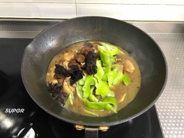 8.加入青椒,木耳和香菇,調入食鹽炒勻,再燉10分鐘