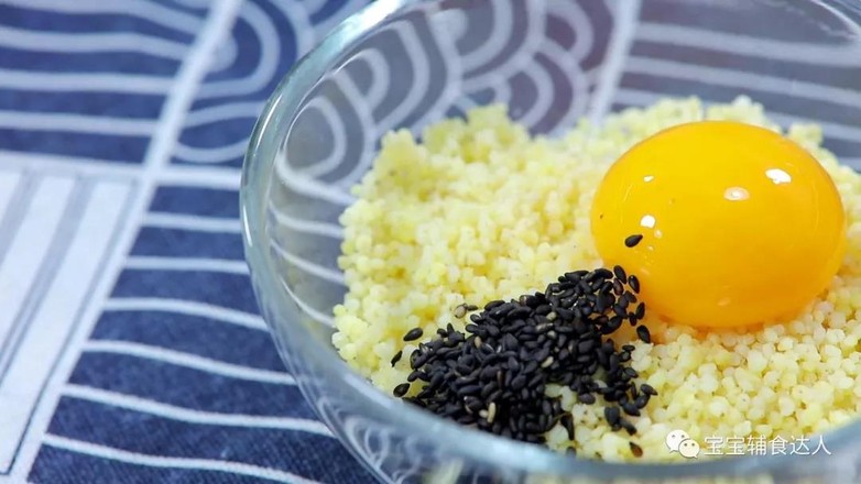 5.準備好的小米飯內,加入一個蛋黃、和少量黑芝麻。