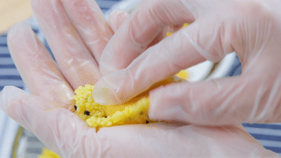 7.取適量小米飯,放在手上,擠壓成餅狀。