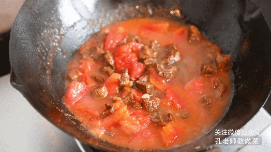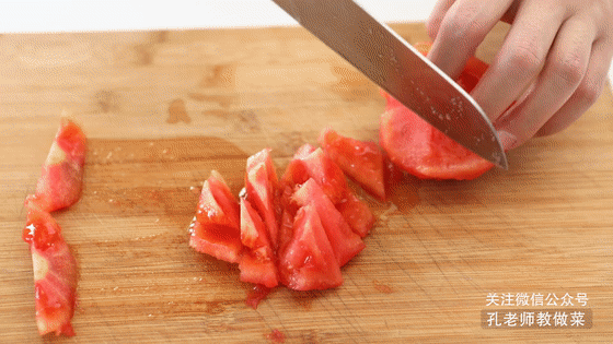 5.鍋中適量油燒熱,下入番茄塊翻炒至出汁。(將番茄去皮做出來口感更好,在番茄頂部輕劃“十”字,放入熱水鍋中煮2-3分鐘,煮至表皮褶皺裂開,取出番茄晾涼后就可以輕易的撕下外皮了。)