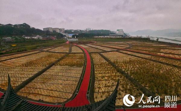 從高處俯瞰五糧液江北園區(qū)尾水凈化生態(tài)濕地,有序排列的廢水處理管道和景觀建筑組成的巨型企業(yè)標(biāo)志,鑲嵌在岷江岸邊,被一片翠綠簇?fù)怼?br />