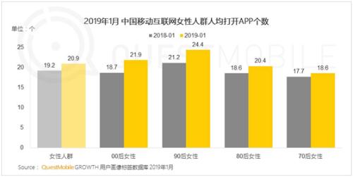 移動大數(shù)據(jù)平臺QuestMobile發(fā)布最新“她經(jīng)濟”洞察報告顯示,截至2019年1月,女性用戶人均打開APP個數(shù)達21個,高于移動互聯(lián)網(wǎng)的平均水平,主要為短視頻、綜合電商、社交等三類。