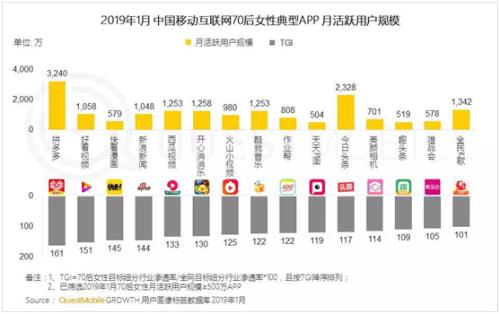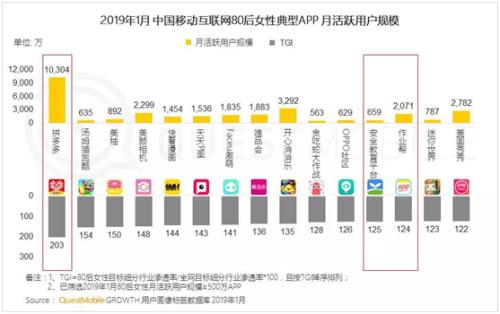 在拼多多、今日頭條、新浪微博、美顏相機及各類短視頻等女性最愛打開的20多個APP中,移動互聯(lián)網(wǎng)70和80后女性最愛使用的典型APP是新電商平臺拼多多,達到3240萬,TGI(Target Group Index,目標群體指數(shù))高達80.5%,超過各類短視頻應用。
