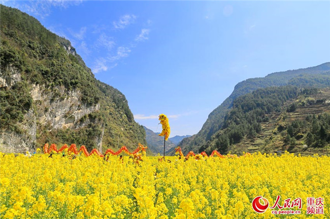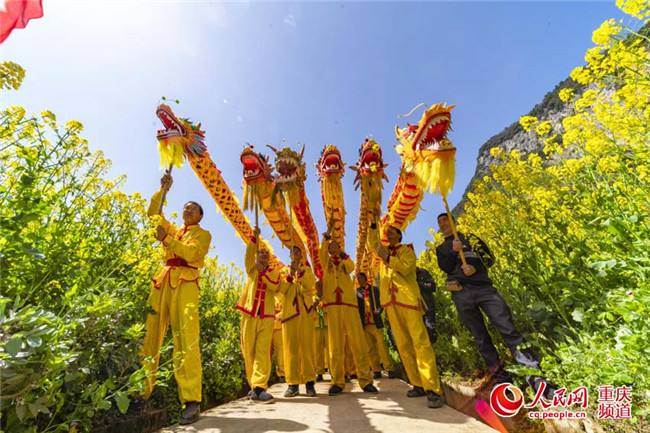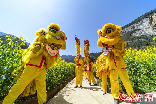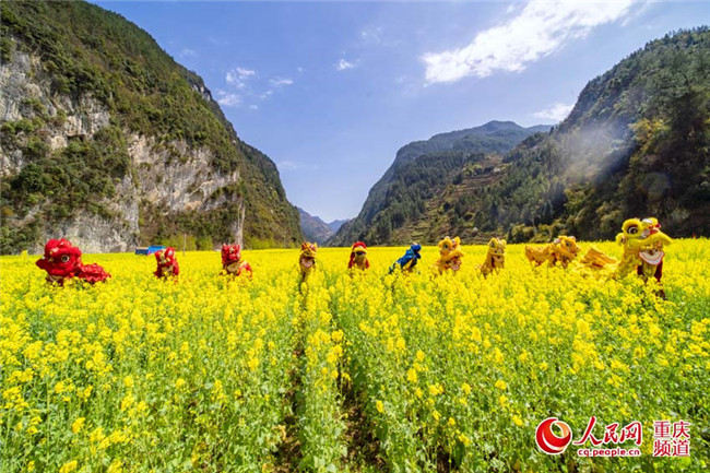 25日,重慶豐都縣暨龍鎮(zhèn)烏羊壩1000畝油菜花盛開(kāi),非遺表演“高桿舞獅”為游客助興。(王嫚 林登周)