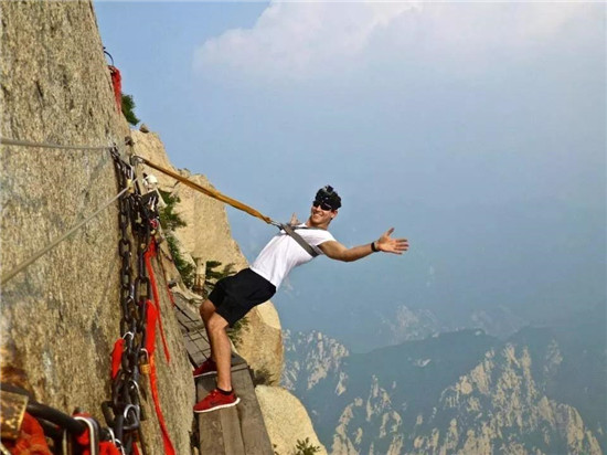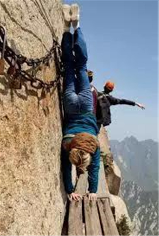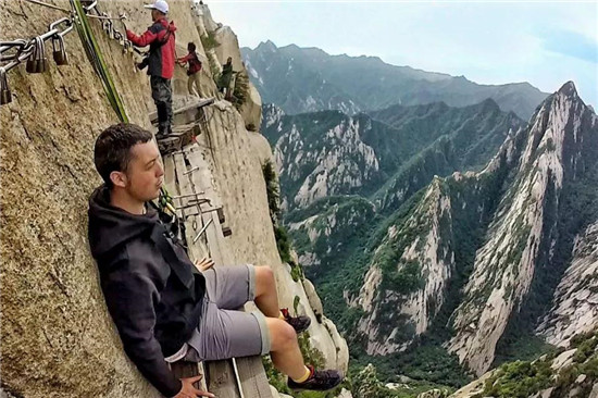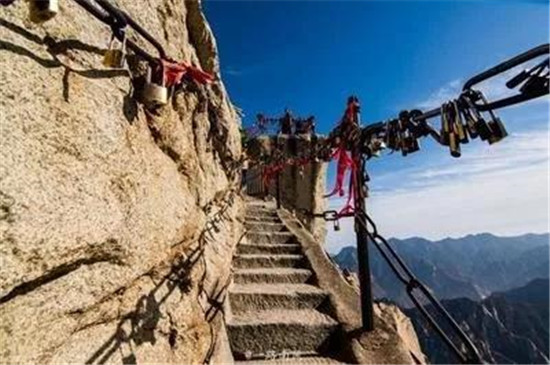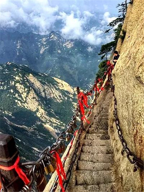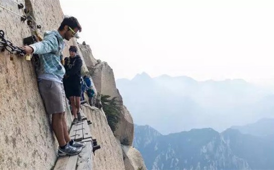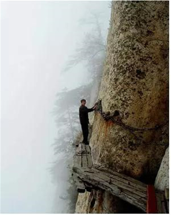 譯:華山上陡峭的長(zhǎng)空棧道于700年前建成,這是那時(shí)的隱士為了找住在深山里神仙而建。