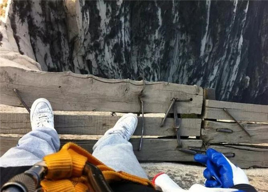 What could possibly go wrong? The tourists trek thousands of feet up a Chinese mountain along wooden boards that were nailed together 700 years ago.