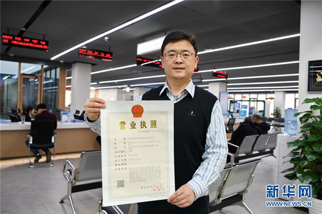 一家入駐雄安新區(qū)的企業(yè)工作人員在市民服務(wù)中心內(nèi)展示辦理的營(yíng)業(yè)執(zhí)照(1月17日攝)。新華社記者 牟宇 攝