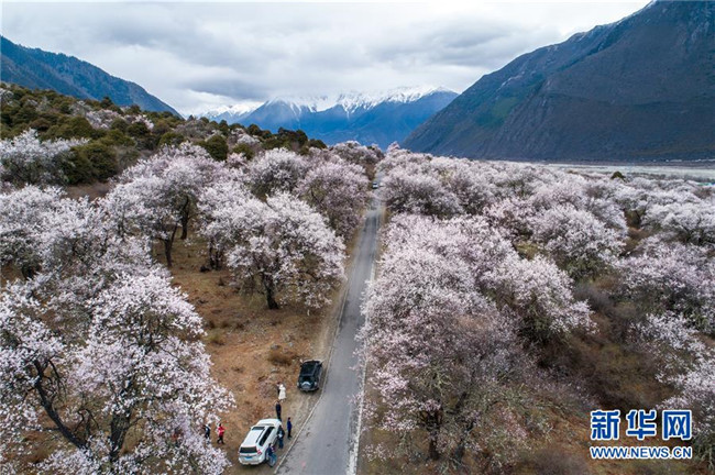 4月2日,游客在波密縣桃花溝游玩(無人機拍攝)。 新華社記者 李鑫 攝