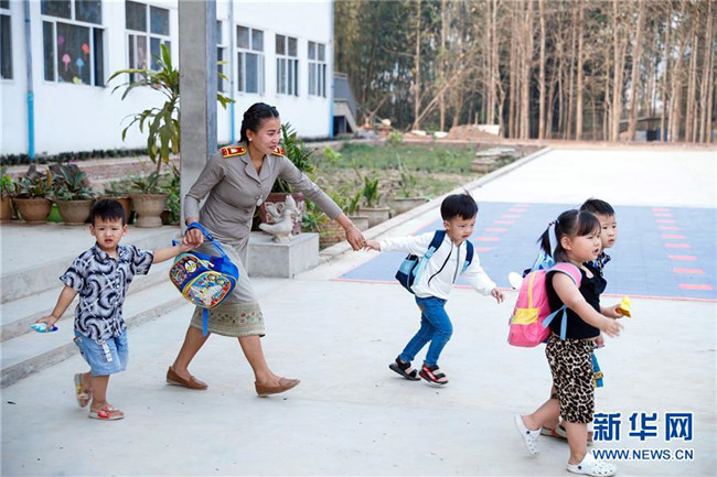 3月22日,在老撾孟賽的中老友誼學(xué)校,一名老師將幼兒園的學(xué)生送出校門。新華社記者 王婧嬙 攝