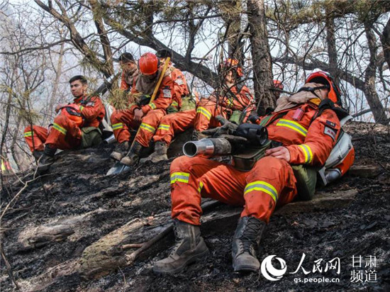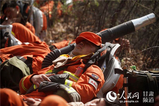 火場(chǎng)火勢(shì)緩解后,消防員原地休息。(甘肅省森林消防總隊(duì)供圖)
