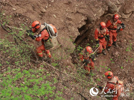 消防指戰(zhàn)員現(xiàn)場(chǎng)開辟臨時(shí)通道,采用繩索攀登的方式組織上山。(甘肅省森林消防總隊(duì)供圖)