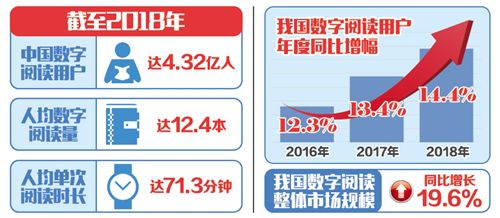 4月12日至14日,第五屆中國(guó)數(shù)字閱讀大會(huì)在杭州召開(kāi)。會(huì)上發(fā)布的《2018年度中國(guó)數(shù)字閱讀白皮書(shū)》顯示,截至2018年,中國(guó)數(shù)字閱讀用戶(hù)總量達(dá)到4.32億,人均數(shù)字閱讀量達(dá)到12.4本,人均單次閱讀時(shí)長(zhǎng)達(dá)71.3分鐘。我國(guó)數(shù)字閱讀整體市場(chǎng)規(guī)模已達(dá)到254.5億元,同比增長(zhǎng)19.6%,大眾閱讀市場(chǎng)規(guī)模占比逾九成,是產(chǎn)業(yè)發(fā)展主導(dǎo)力量。