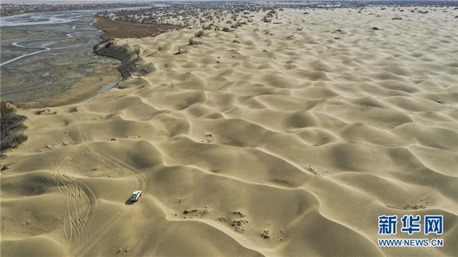 依明乘坐的汽車行駛在塔克拉瑪干沙漠中。從依明家坐車前往于田縣城,全程不足300公里,越野車需行駛7小時(shí)左右(3月19日無人機(jī)拍攝)。新華社記者 胡虎虎 攝