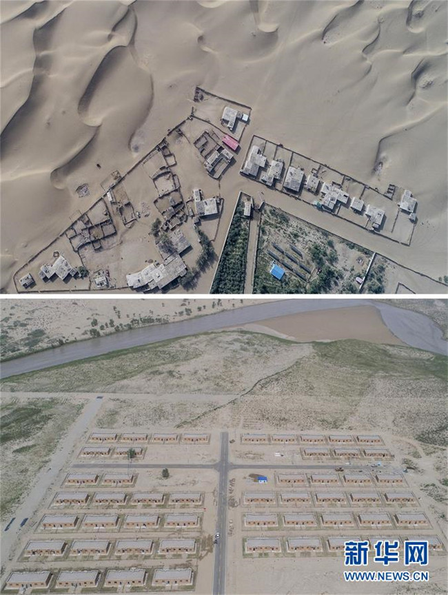 拼版照片:上圖為地處沙漠腹地的新疆于田縣達(dá)里雅布依鄉(xiāng)一處村落(2018年9月6日無人機(jī)拍攝);下圖為建設(shè)中的達(dá)里雅布依小鎮(zhèn)易地扶貧安置點(diǎn)(2018年9月8日無人機(jī)拍攝)。新華社記者 胡虎虎 攝