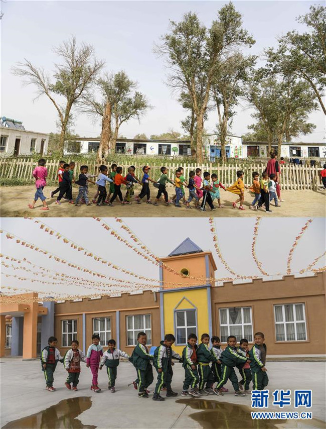 拼版照片:上圖為新疆于田縣達(dá)里雅布依鄉(xiāng)小學(xué)的學(xué)生走在校園里(2018年9月5日攝);下圖為學(xué)生們?cè)谶_(dá)里雅布依小鎮(zhèn)易地扶貧安置點(diǎn)的新校舍前(2019年3月20日攝)。新華社記者 胡虎虎 攝