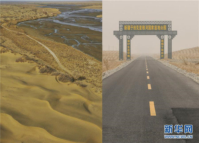 拼版照片:左圖為沿著克里雅河通向地處沙漠深處新疆于田縣達(dá)里雅布依鄉(xiāng)的路(3月19日無人機(jī)拍攝);右圖為從縣城通往達(dá)里雅布依小鎮(zhèn)易地扶貧安置點(diǎn)的柏油路(3月20日攝)。新華社記者 胡虎虎 攝