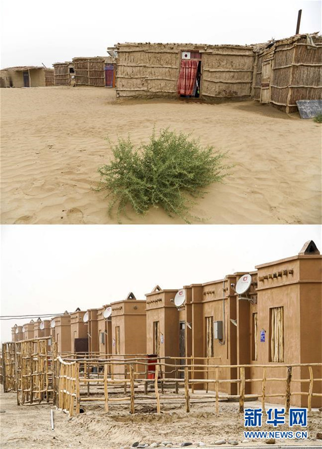 拼版照片:上圖為新疆于田縣達(dá)里雅布依鄉(xiāng)的民居(2018年9月7日攝);下圖為達(dá)里雅布依小鎮(zhèn)易地扶貧安置點(diǎn)的房屋(2019年3月20日攝)。新華社記者 胡虎虎 攝