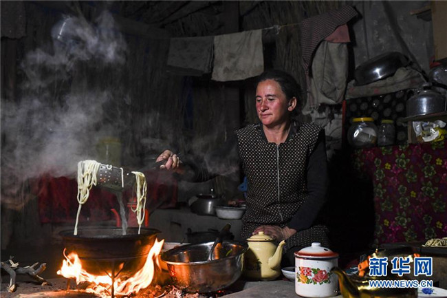 在地處塔克拉瑪干沙漠腹地的于田縣達(dá)里雅布依鄉(xiāng)5小隊(duì),依明的妻子在夜間做拌面(3月16日攝)。新華社記者 胡虎虎 攝