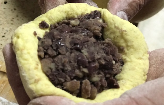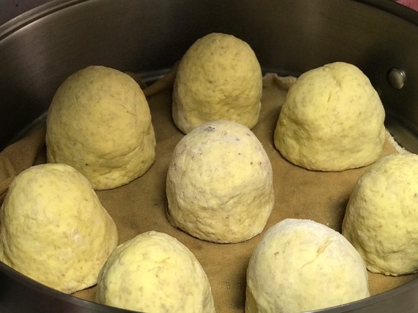 6.制作三合面:三種面粉加酵母混合均勻,然后一點點加溫水和成軟硬適中的面團,在溫暖處發(fā)酵至兩倍大。