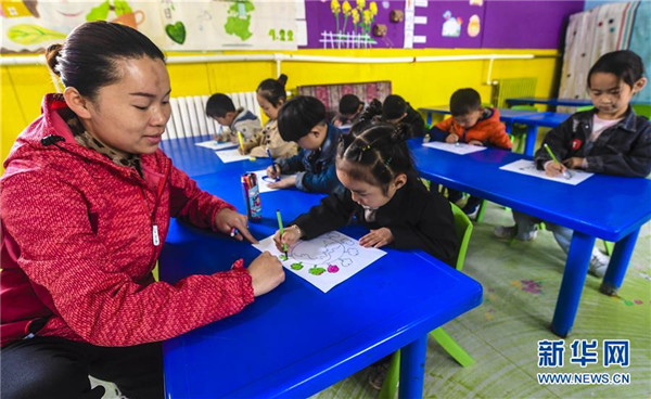4月21日,在河北省饒陽(yáng)縣小哈佛幼兒園開(kāi)展的“愛(ài)護(hù)地球 從我做起”主題活動(dòng)中,老師指導(dǎo)學(xué)生手繪愛(ài)護(hù)地球環(huán)境繪畫(huà)作品。