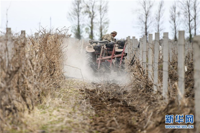 在新疆生產(chǎn)建設(shè)兵團(tuán)第六師共青團(tuán)農(nóng)場(chǎng)的葡萄地中,一名農(nóng)機(jī)手操縱一輛小型農(nóng)機(jī)在犁地(4月22日攝)。