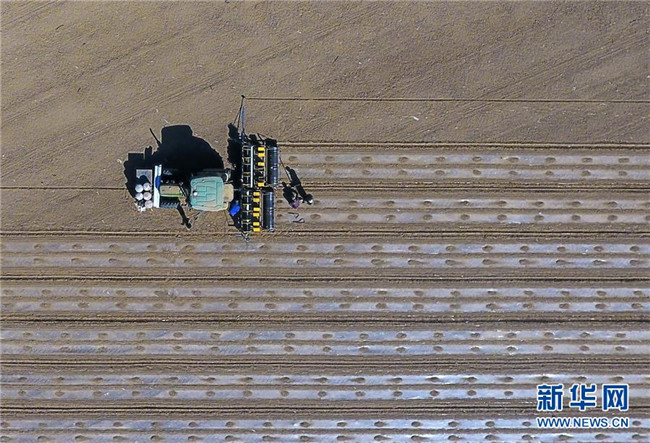 在新疆生產(chǎn)建設(shè)兵團(tuán)第六師共青團(tuán)農(nóng)場(chǎng)的棉花地中,一名農(nóng)場(chǎng)職工在無(wú)人駕駛精量播種機(jī)播種之后的棉田上,檢查地膜表面壓土情況(4月22日攝)。