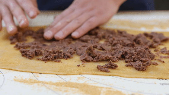 17.將紅豆餡均勻的抹在糯米面片上。(紅豆沙不能太干,太干不太好卷,也不能太稀,太稀用刀一切就流出來了。如果能買的高品質(zhì)的紅豆沙最好,做驢打滾紅豆沙是非常重要的,如果買不到口感好的紅豆沙,建議你在家自己做。)
