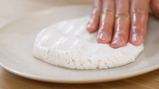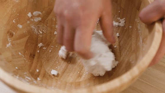 9.待其均勻吸收水分后,將結(jié)塊的糯米粉團揉成光滑的面團。