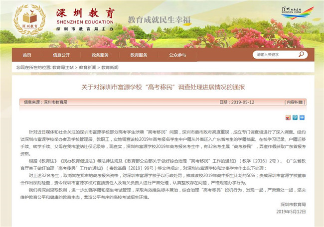 深圳市教育局網(wǎng)站12日發(fā)布《關(guān)于對深圳市富源學(xué)校“高考移民”調(diào)查處理進(jìn)展情況的通報》(以下簡稱《通報》)?!锻▓蟆分赋觯航?jīng)查實,深圳市富源學(xué)校2019年高考報名考生中,有32名考生屬“高考移民”,弄虛作假獲取廣東省報考資格。將取消此32名考生在深圳市的高考報名資格。