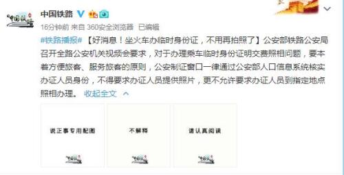 據(jù)中國(guó)鐵路總公司官方微博消息,公安部鐵路公安局召開全路公安機(jī)關(guān)視頻會(huì)要求,對(duì)于辦理乘車臨時(shí)身份證明交費(fèi)照相問題,要本著方便旅客、服務(wù)旅客的原則,公安制證窗口一律通過公安部人口信息系統(tǒng)核實(shí)辦證人員身份,不得要求辦證人員提供照片,更不允許要求辦證人員到指定地點(diǎn)照相辦理。