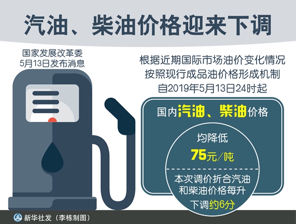國內(nèi)汽油、柴油價(jià)格將迎來下調(diào)。國家發(fā)展改革委13日發(fā)布消息,根據(jù)近期國際市場(chǎng)油價(jià)變化情況,按照現(xiàn)行成品油價(jià)格形成機(jī)制,自2019年5月13日24時(shí)起,國內(nèi)汽油、柴油價(jià)格每噸均降低75元。