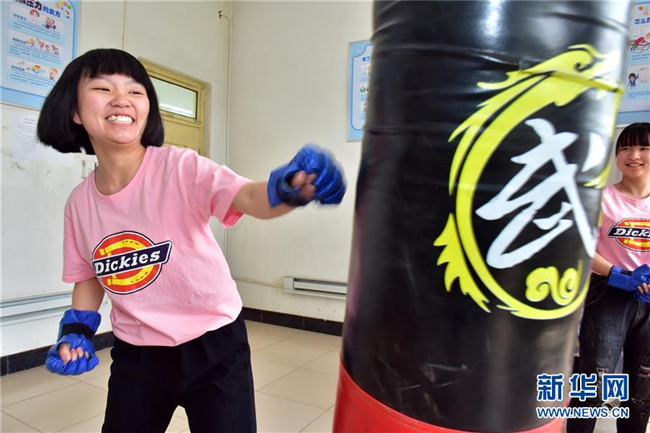 5月14日,河北省石家莊新樂市第二中學(xué)高三學(xué)生在學(xué)校設(shè)立的“宣泄室”擊打沙袋。 新華社發(fā)(賈敏杰 攝)