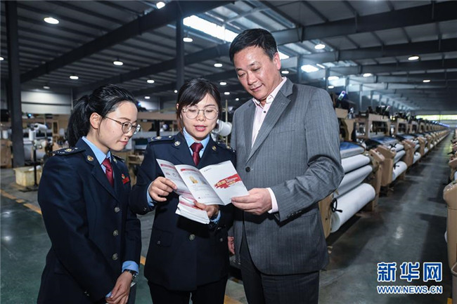 浙江省長(zhǎng)興縣稅務(wù)部門(mén)工作人員在一家公司的車(chē)間內(nèi)向企業(yè)負(fù)責(zé)人宣傳減稅降費(fèi)政策(4月16日攝)。新華社記者 徐昱 攝