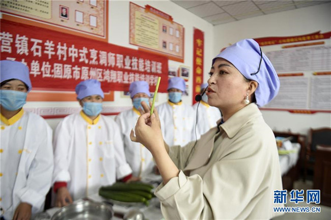 培訓(xùn)老師在中式烹調(diào)師職業(yè)技能培訓(xùn)班上為寧夏固原市原州區(qū)頭營(yíng)鎮(zhèn)石羊村婦女講解食材選用規(guī)范(5月14日攝)。 新華社發(fā)(馮開(kāi)華 攝)