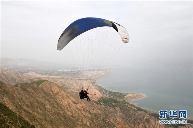 在永靖縣境內的黃河三峽,游客體驗高空滑翔傘(5月19日攝)。 坐落于甘肅省永靖縣境內的黃河三峽,由炳靈峽、劉家峽、鹽鍋峽組成,屬黃河上游。黃河三峽兩岸人文景觀豐富,自然風光秀美。 新華社記者 范培珅 攝