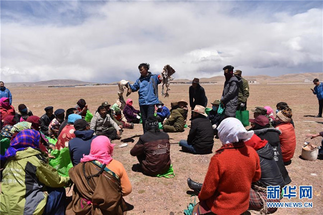5月28日,瑪曲鄉(xiāng)黨委書記朗卡江村(中)向參加活動的村民講解如何區(qū)分可回收垃圾與不可回收垃圾。新華社記者 周錦帥 攝