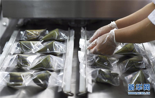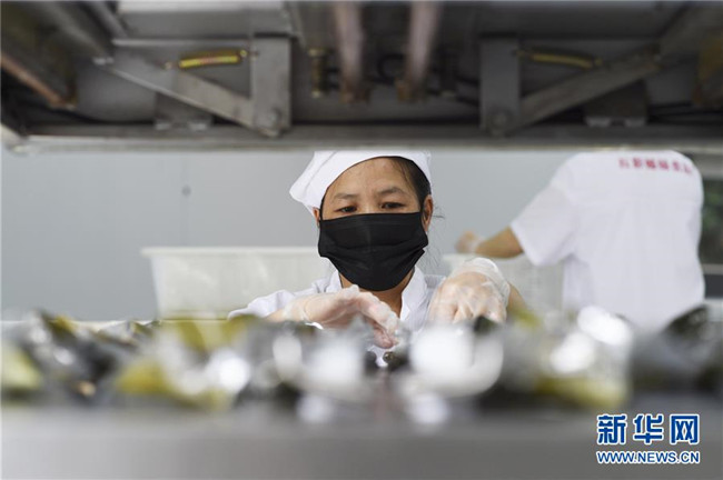 6月2日,在臺江縣一家食品生產(chǎn)企業(yè)車間,工人將煮熟的五彩粽進(jìn)行真空包裝?!⌒氯A社發(fā)(劉開福 攝)