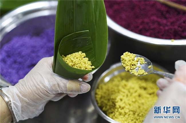 6月2日,在臺江縣一家食品生產(chǎn)企業(yè)車間,工人在包制五彩粽?!⌒氯A社發(fā)(劉開福 攝)