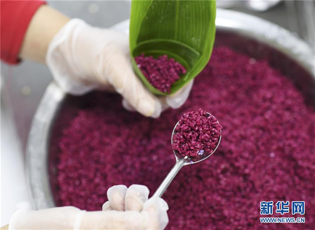 端午節(jié)將至,貴州省黔東南苗族侗族自治州臺江縣粽子加工企業(yè)加緊制作具有當(dāng)?shù)靥厣奈宀属占案魇紧兆?,滿足市場需求。