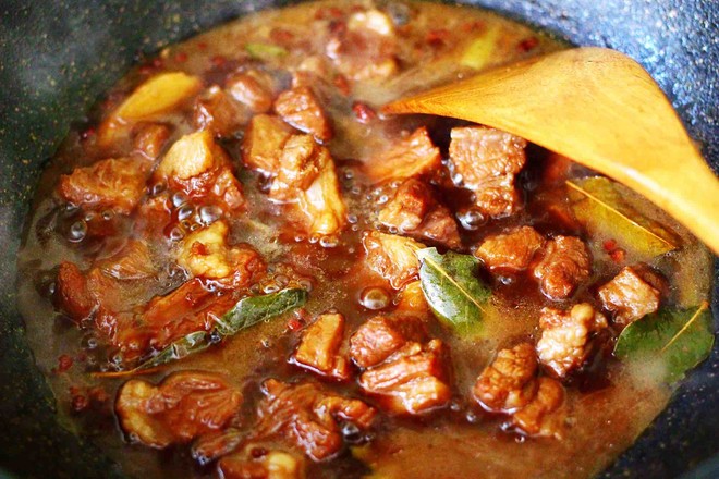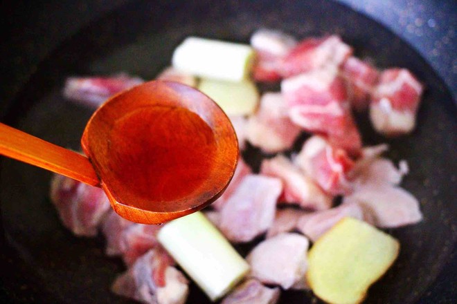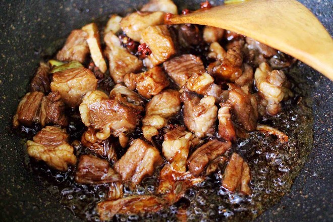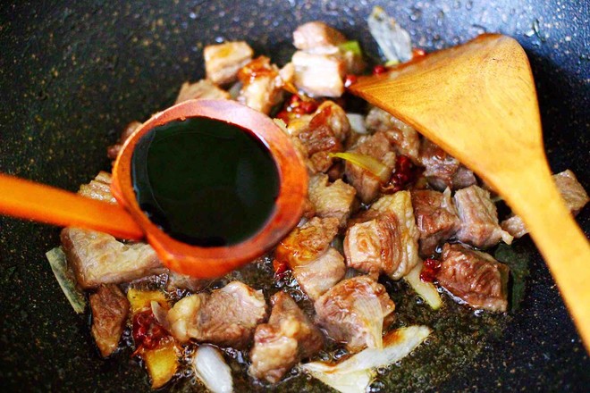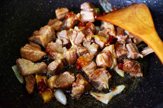 9.這個(gè)時(shí)候放入焯水的牛肉塊,大火翻炒片刻。